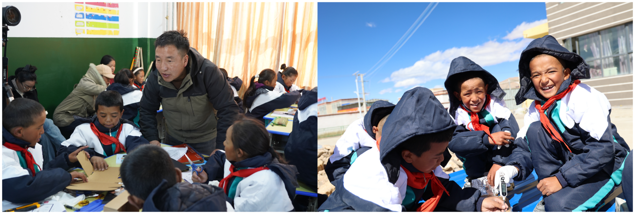 在《光明之力——駕馭“太陽神的光輝”》實踐課程上,同學(xué)們既了解了申扎當(dāng)?shù)氐奶柲軆?yōu)勢,又親手體驗了將太陽能轉(zhuǎn)化為熱能制作“烤箱”以及太陽能轉(zhuǎn)化為電能啟動風(fēng)車的神奇。在《小鹿快跑——探尋“生命之網(wǎng)的奧秘”》特色課上,小營員們認(rèn)識到申扎多樣的動植物資源,并通過化身“草”“小鹿”“狼”“陽光”“水源”,親身體驗生態(tài)系統(tǒng)的“動態(tài)平衡”,進(jìn)一步體會生物多樣性對申扎生態(tài)安全的重要性。在《凈水之心——對抗“污染水質(zhì)的魔怪”》、《生態(tài)之環(huán)——治愈“破壞生態(tài)的荒蕪”》實踐中,孩子們帶著采樣工具奔赴河流兩岸,小心翼翼地采集河水樣本并用快速檢測工具箱檢測水質(zhì);學(xué)生們沿著河岸撿拾塑料瓶、包裝袋等垃圾,專家講師及志愿者現(xiàn)場教學(xué)生們分辨可回收物與其他垃圾,讓“垃圾變廢為寶”的理念深入人心;在《生態(tài)環(huán)??倓訂T——滴水不羼》實驗課上,在專家講師及志愿者的帶領(lǐng)下,學(xué)生們見證了所采集的污水重回清澈,對水污染治理有了初步的了解和認(rèn)識。